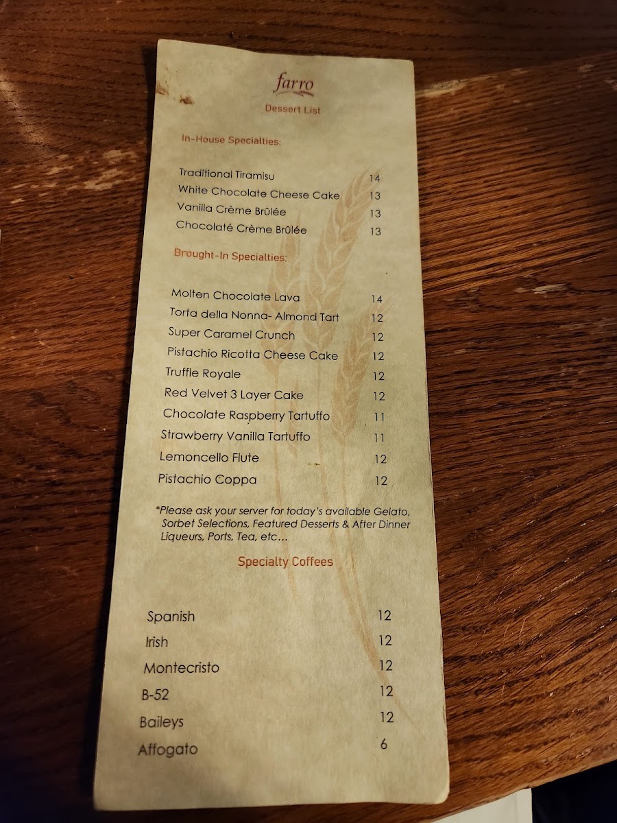 Farro Ristorante Menu